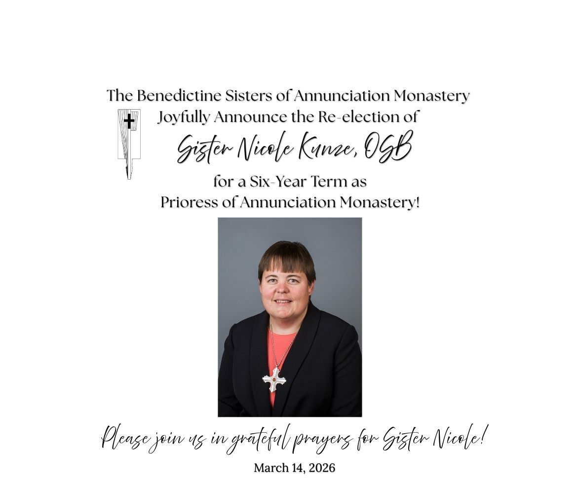 Directly following election, Sister Nicole was formally re-installed as prioress on Saturday, March 14, 2026, in the presence of the Benedictine Sisters of Annunciation Monastery and election facilitator, Sister Kimberly Porter of St. Walburg Monastery, Covington, Ky., and Sister Nancy Bauer of Saint Benedict’s Monastery, St. Joseph, Minn., and president of the Monastic Congregation of Saint Benedict.